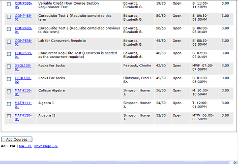 The Course Search Results screen displays the information returned by conducting a Course Search.